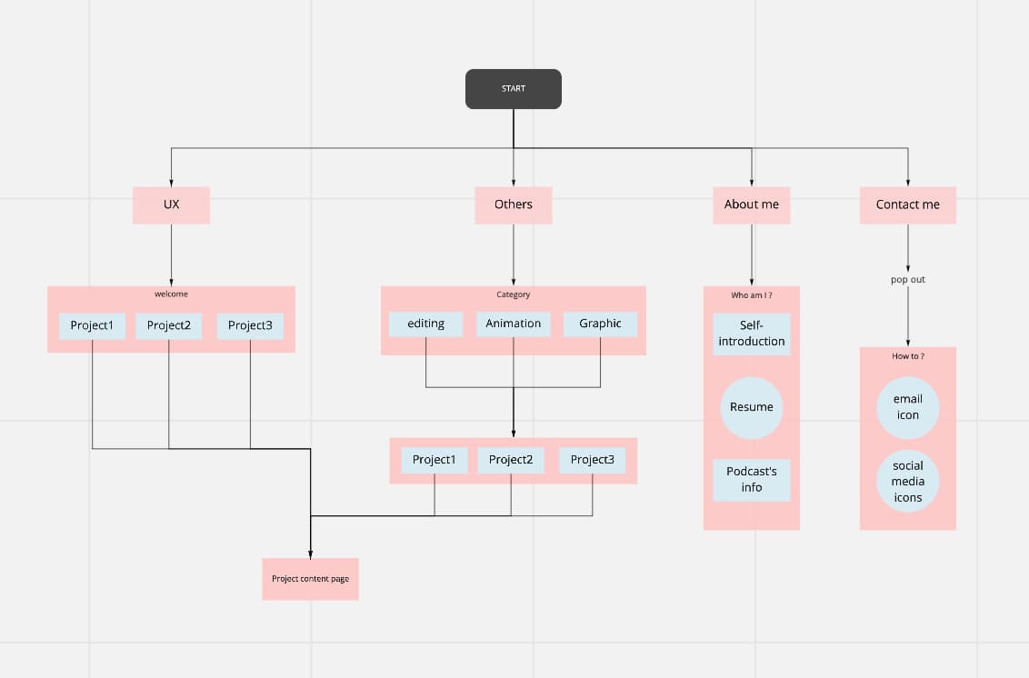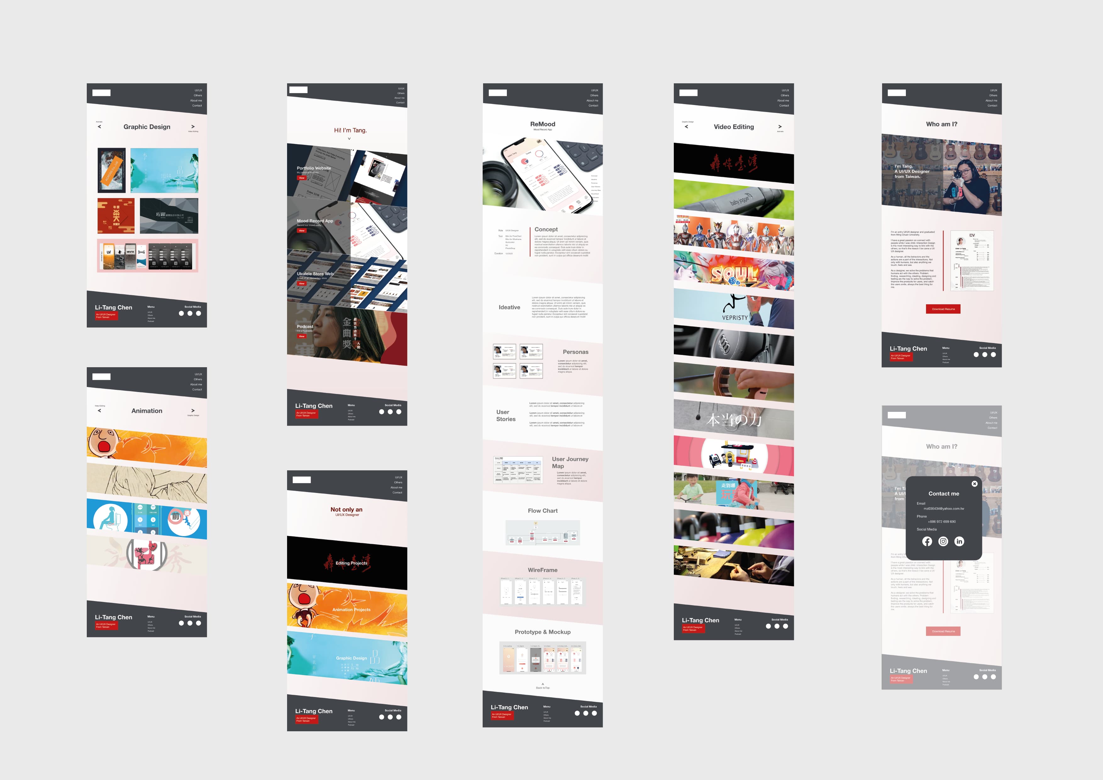 To create a unique portfolio website, how to make users more focused is my main idea for this project. Oblique rectangle is the main element of the website, changing the angle of the figure a bit can make a big difference in the visual presentation. The color chooses are dark gray and dark red with a little pink, presenting the image of stability and innovation.